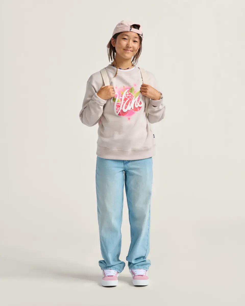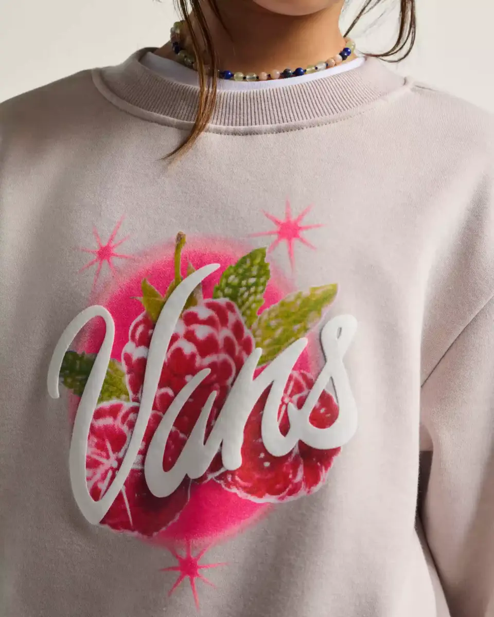 Un sweat-shirt ras du cou mi-épais avec un imprimé framboise sur la poitrine et un logo Vans en relief.