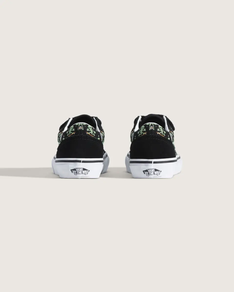 La Little Kids Old Skool V apporte de la lueur avec des graphismes extraterrestres qui brillent dans le noir et une bande latérale qui illumine la nuit. Dotée de brides auto-agrippantes faciles à enfiler et de détails en daim résistant, cette version classique est conçue pour les aventures quotidiennes hors du commun.
