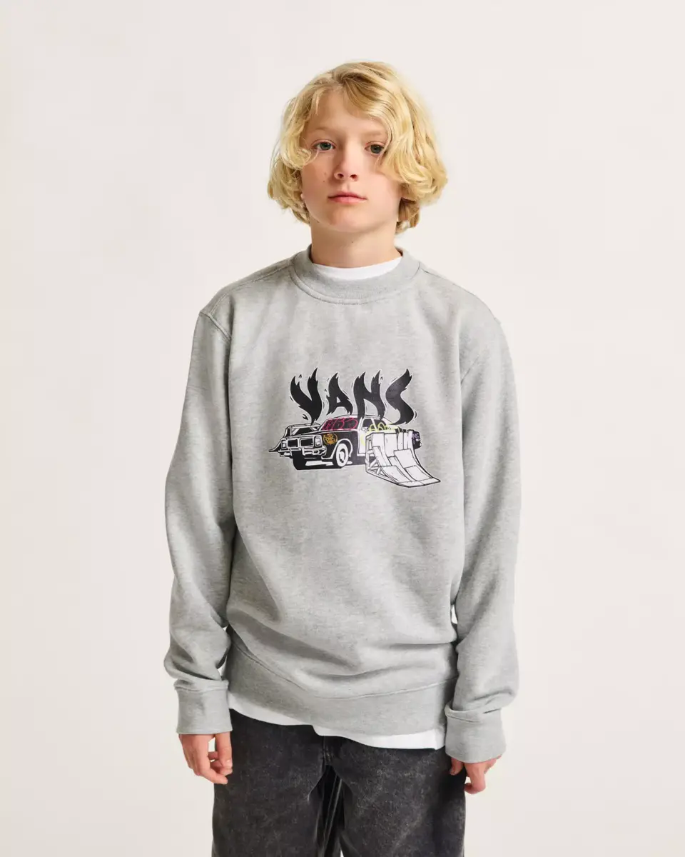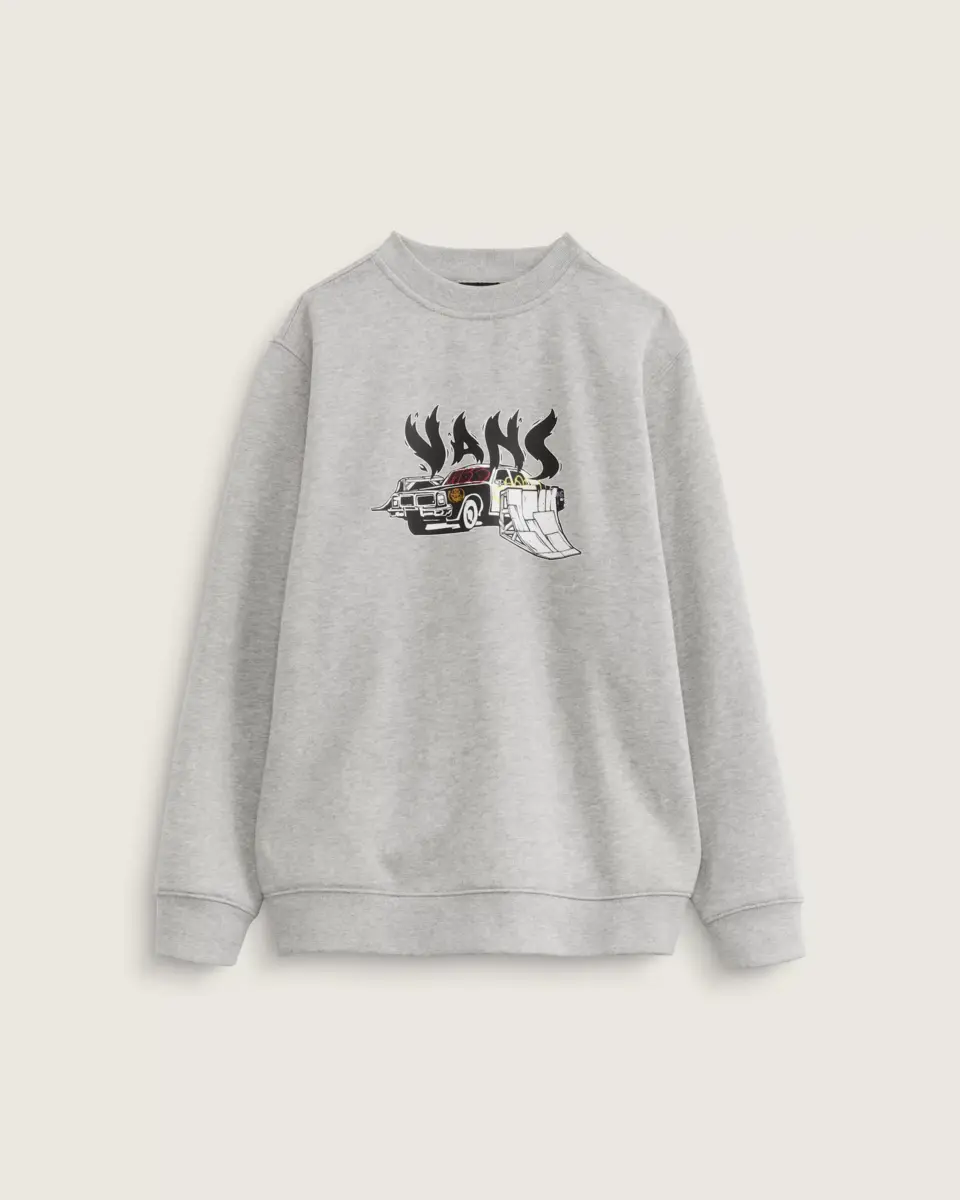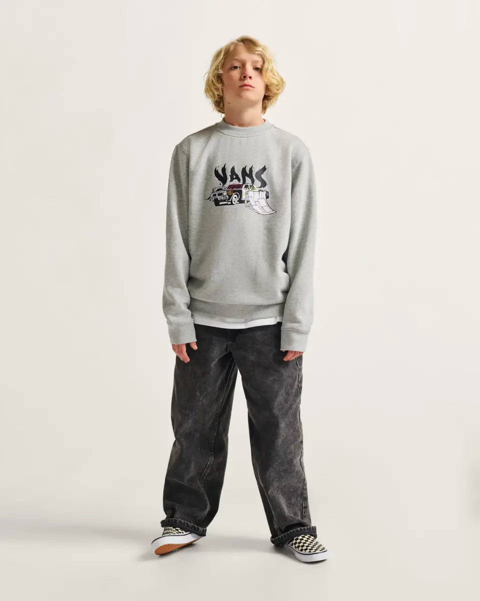 Le sweat-shirt ample à col rond pour enfants Copout est un sweat-shirt classique à manches longues et col rond avec des détails côtelés, avec un graphisme sérigraphié d’une voiture de police grillée prête à sauter sur votre planche avec un logo Vans® flottant par-dessus.