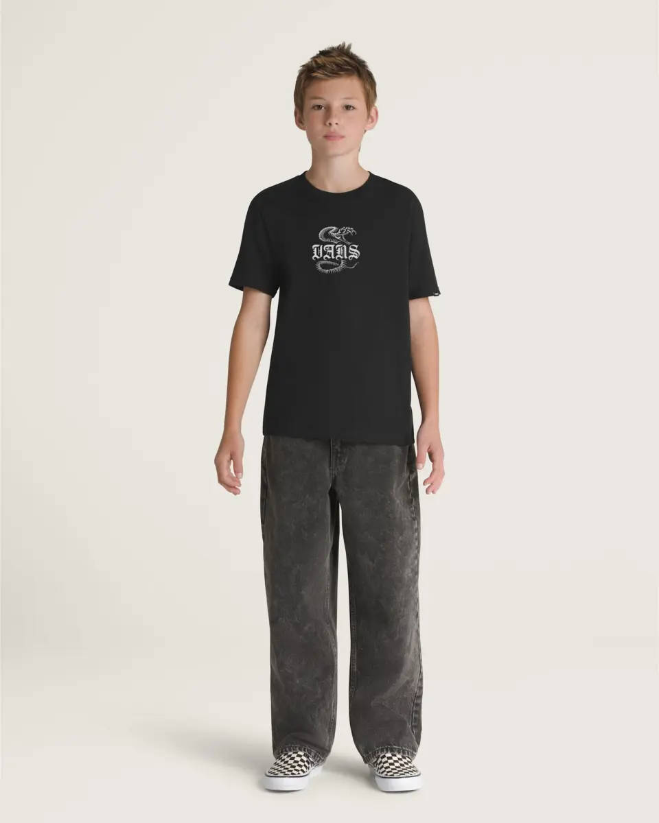 • Col ras du cou pour un look classique. Fabrication cardée à anneaux pour un t-shirt plus doux et plus lisse. Motif sérigraphié phosphorescent. Illustrations d’os de dinosaures avec inscription Vans personnalisée. Col sans étiquette pour un toucher doux. Manches courtes, coupe standard enfant. 100 % coton.