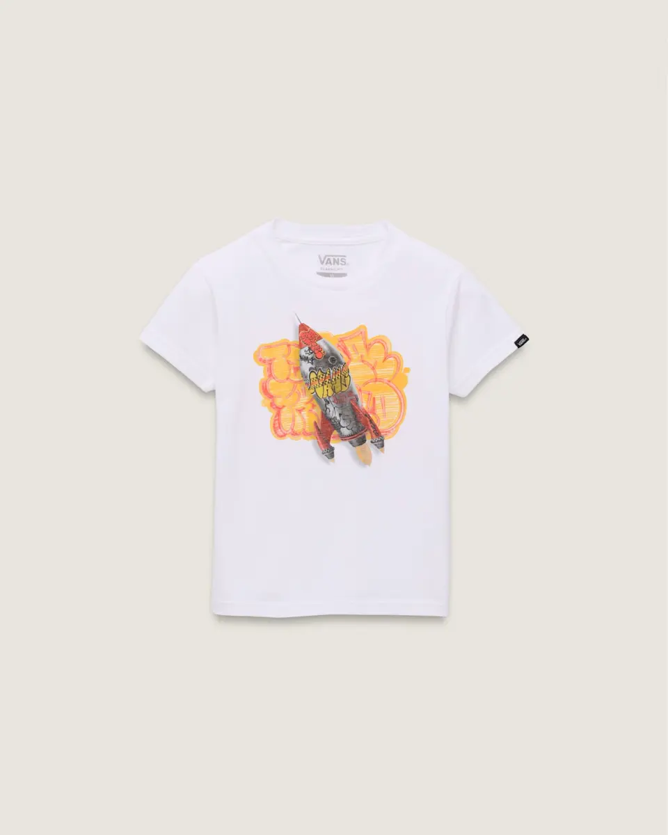 Décollez avec le t-shirt Rocket pour enfants, un t-shirt classique à manches courtes en coton respirant avec un motif de fusée sur la poitrine et des détails de style graffiti.