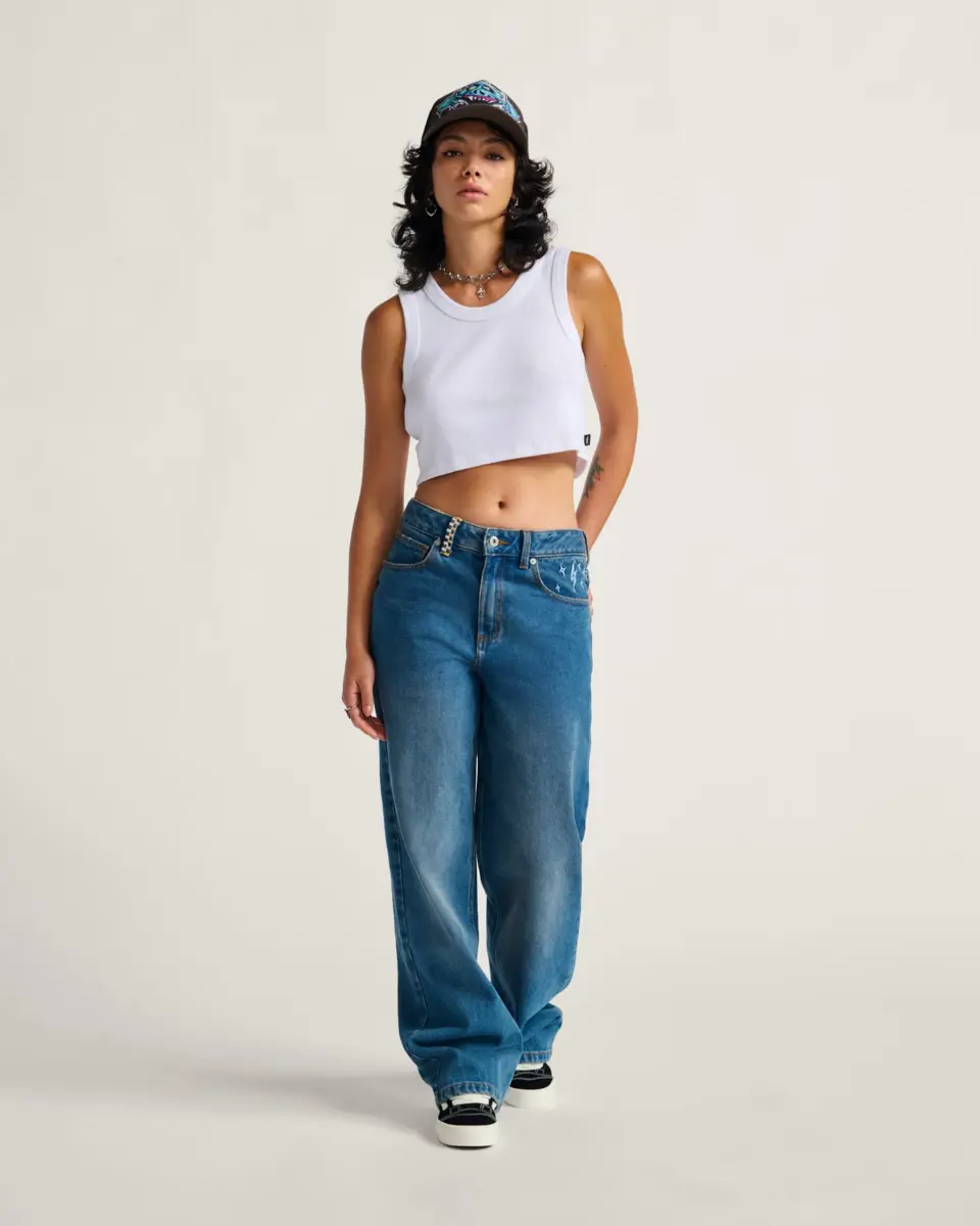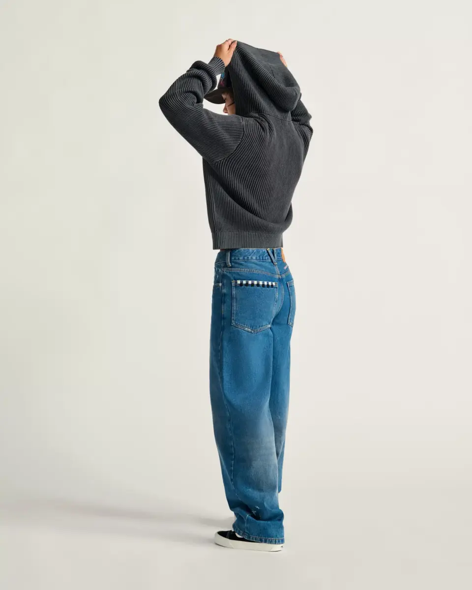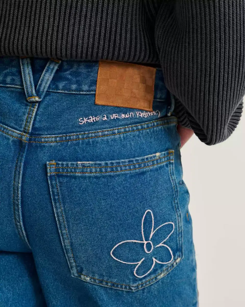 Le pantalon en jean brodé Sirelle nous ramène dans le passé avec un clin d’œil à la nostalgie du skate. Confectionné en denim épais 14 oz avec un délavage légèrement délavé pour un look usé, ce pantalon taille mi-haute et ample atteint une longueur idéale pour une silhouette parfaitement imparfaite. Les détails de broderie et les touches de damier ajoutent un caractère subtil.