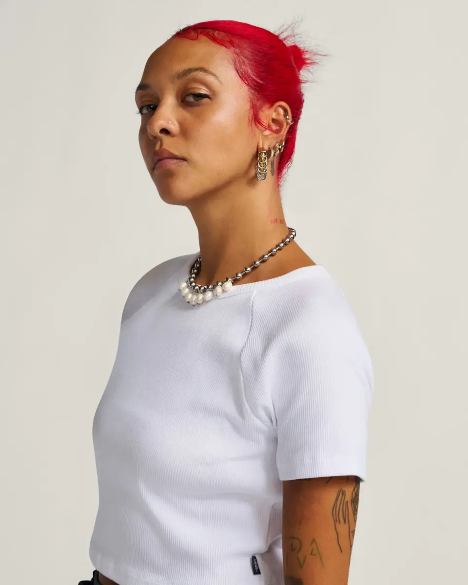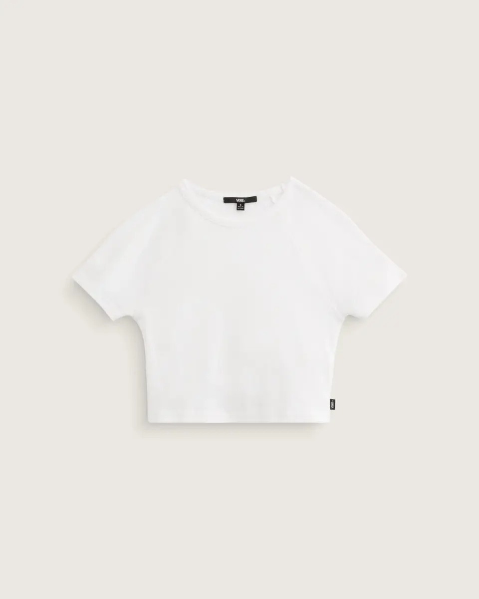 Inspirez-vous des années 90 avec le t-shirt Drew Baby, un t-shirt ajusté en maille côtelée passe-partout, plus long qu’un crop top, mais plus court qu’une coupe classique. Une étiquette drapeau Vans® à l’ourlet complète le style streetwear.