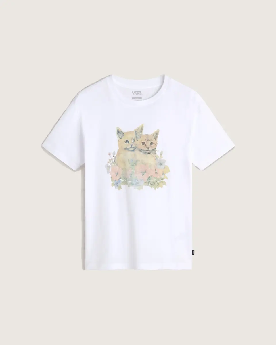 Incarnez la gentillesse avec le t-shirt Vintage Smitten, un t-shirt ras du cou oversize en jersey de coton épais. Il arbore un motif de chatons assis parmi des fleurs et un logo Vans®.