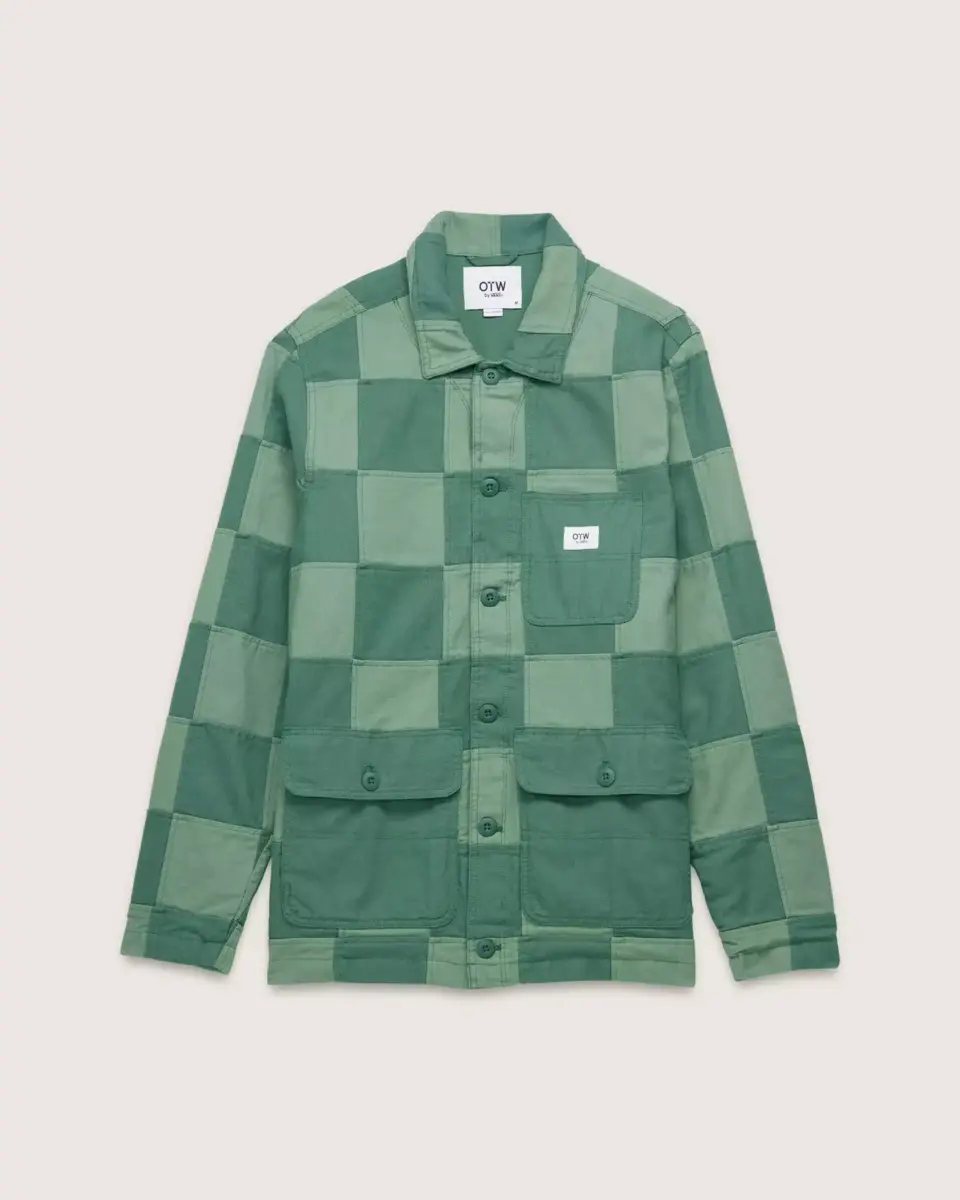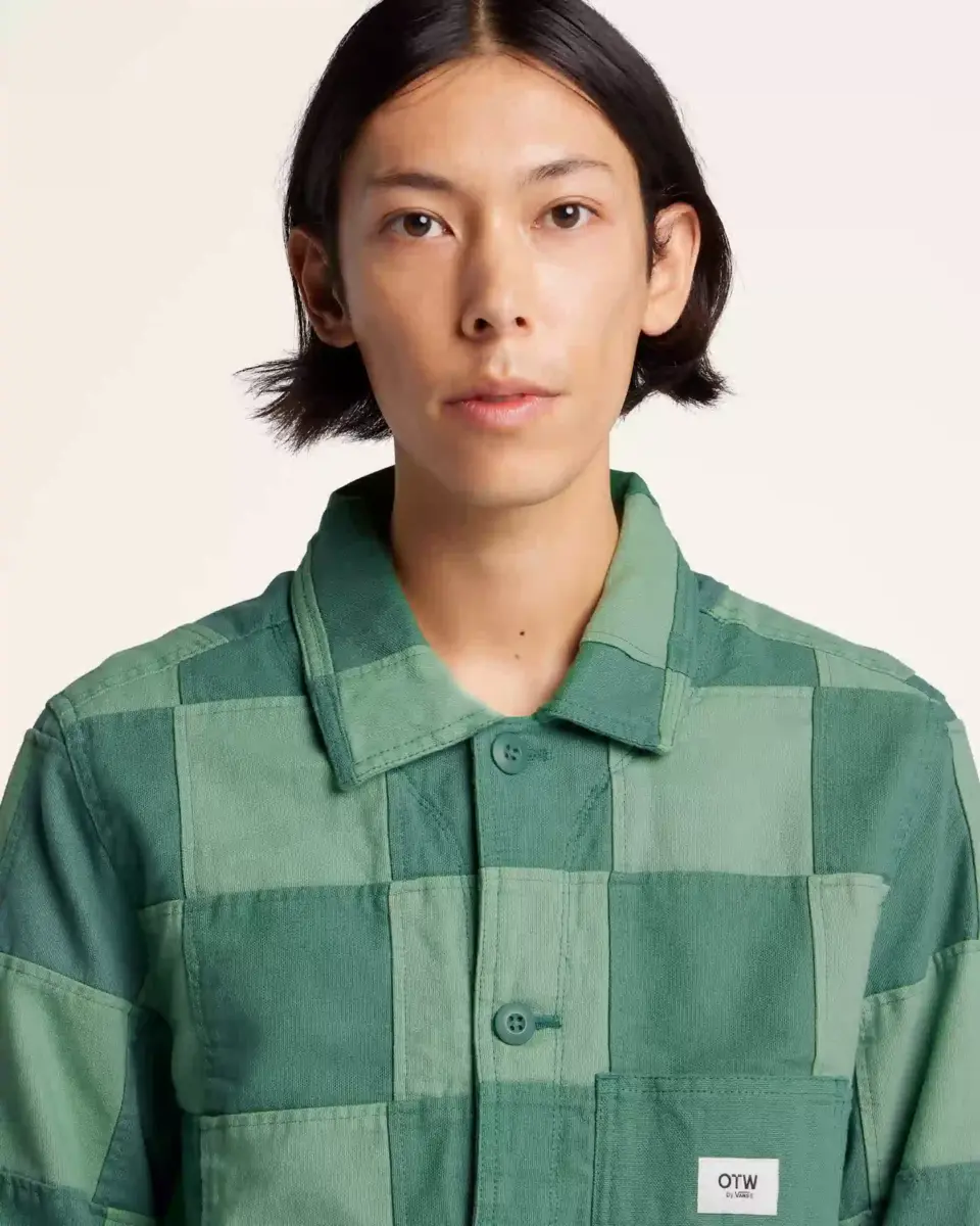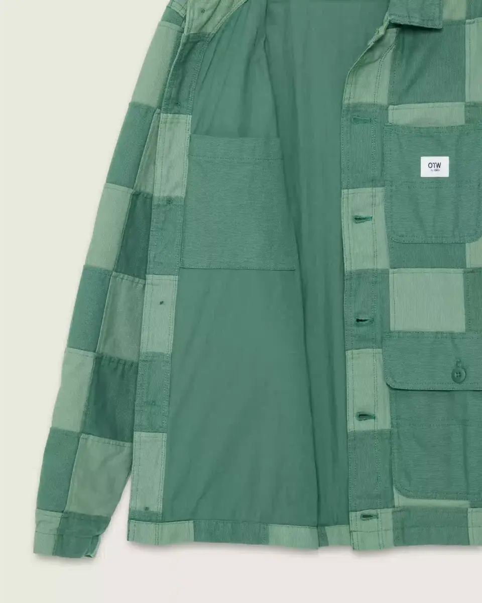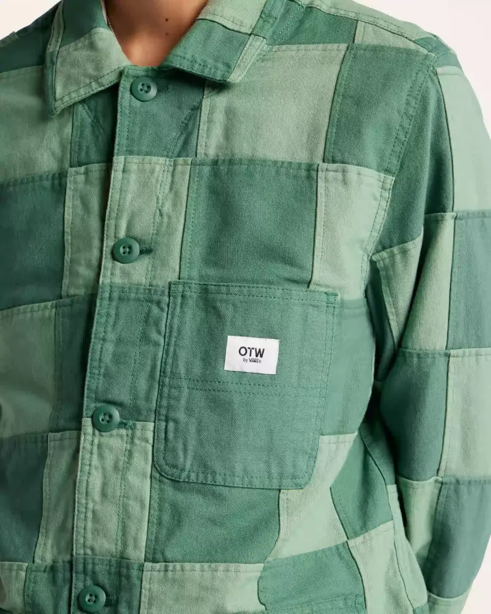 Veste de travail en tissu patchwork bicolore, poches plaquées à double entrée à la poitrine et à la taille, fermeture à boutons militaires sur le devant, étiquette OTW® intérieure et étiquette OTW® extérieure pour vêtements de travail.