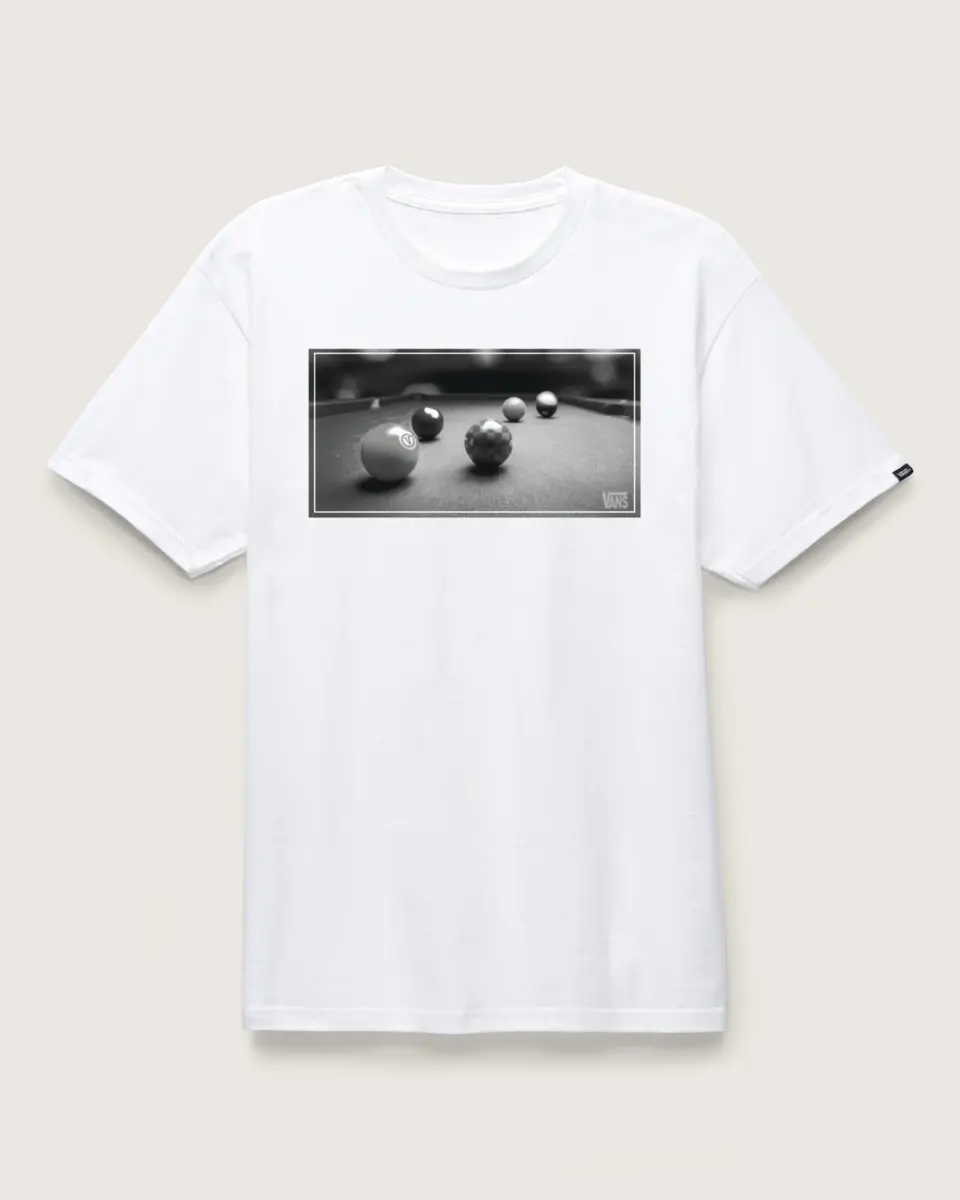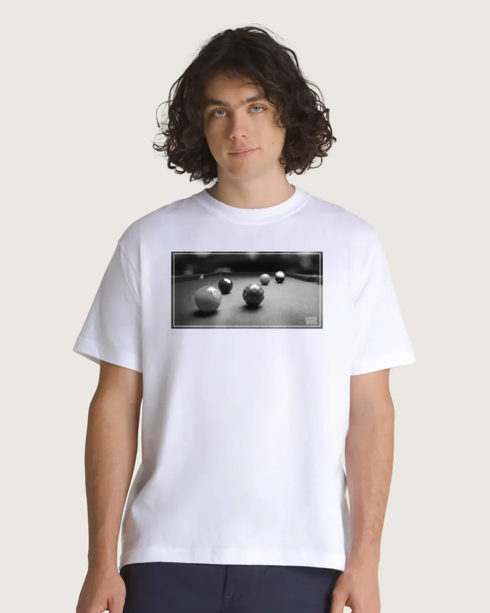 Le Pocket T-Shirt est un T-shirt à manches courtes et col ras du cou en coton épais avec un graphisme sérigraphié d’un jeu de billard.