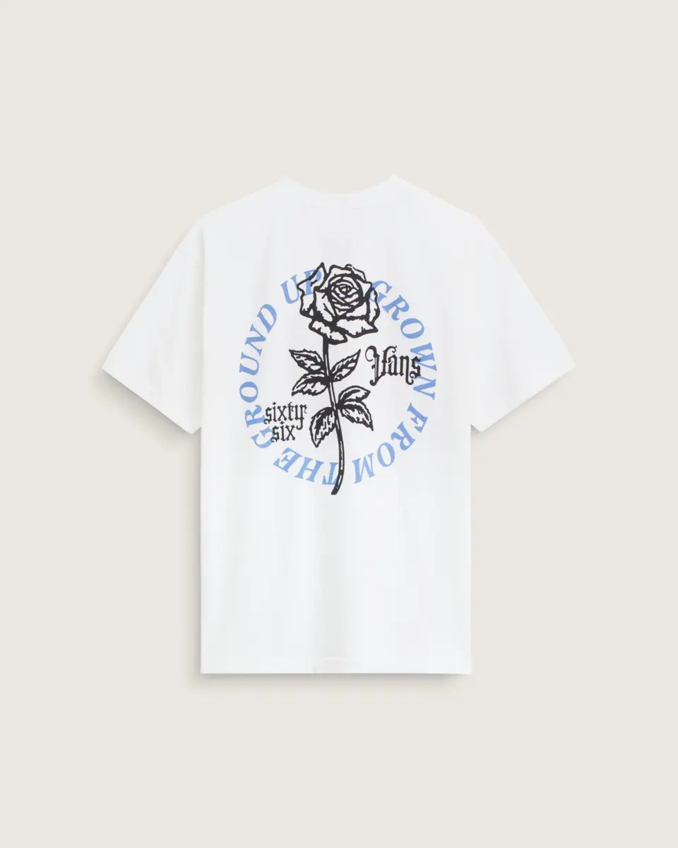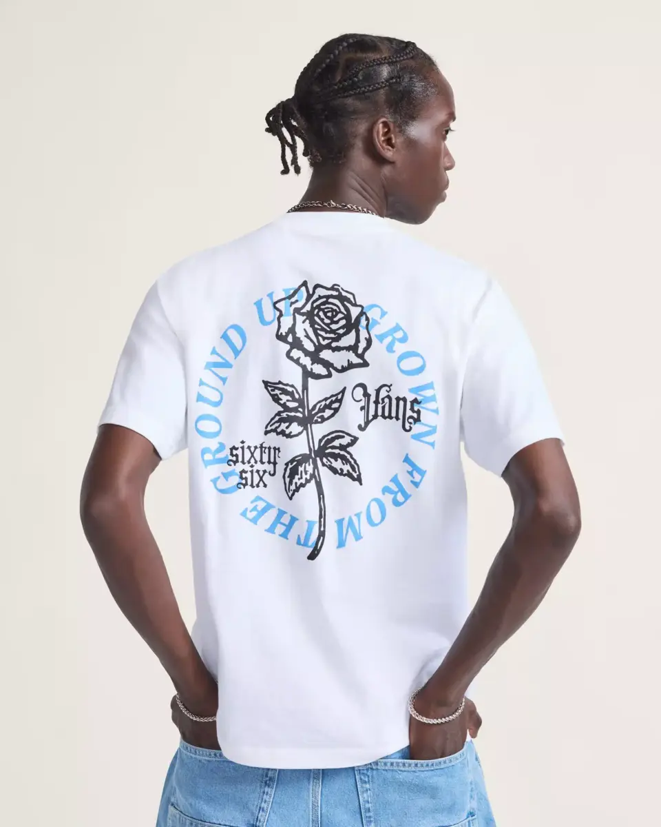 Épanouissez-vous avec le t-shirt Grown From The Ground Up, un col ras du cou au look classique. La sérigraphie présente un logo Vans scripté durable surmontant une rose sur le devant, tandis que les manches courtes offrent un style décontracté au quotidien.
