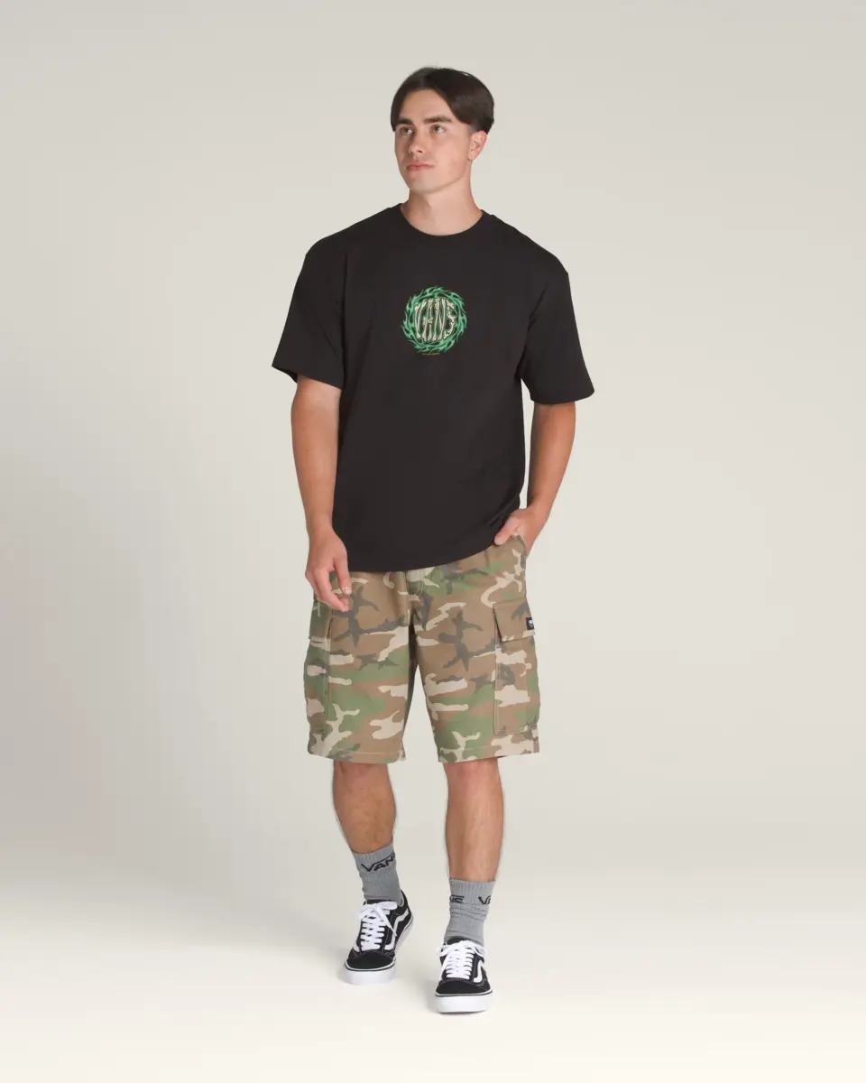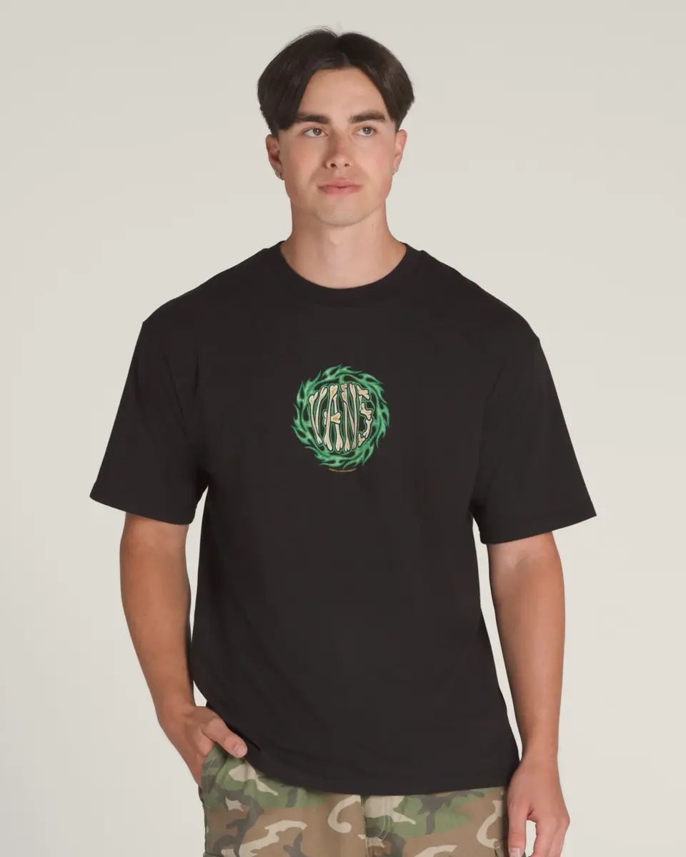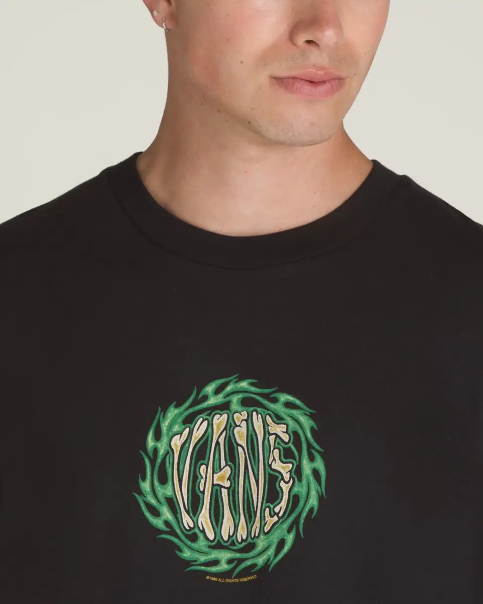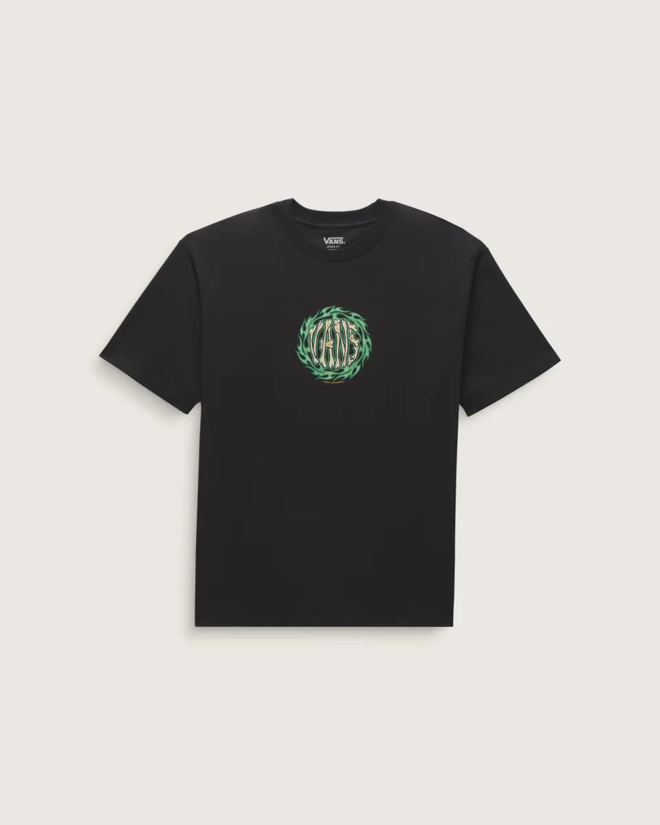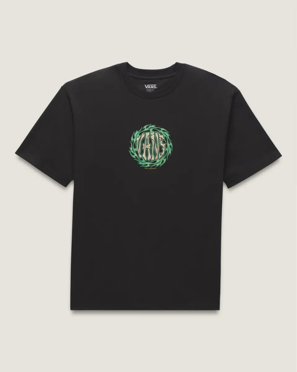 Brûlez de mille feux avec le t-shirt 2K Flame, un t-shirt ample à manches courtes et col ras du cou avec un graphisme sérigraphié d’un logo Vans® osseux sur le devant, entouré de flammes vertes.