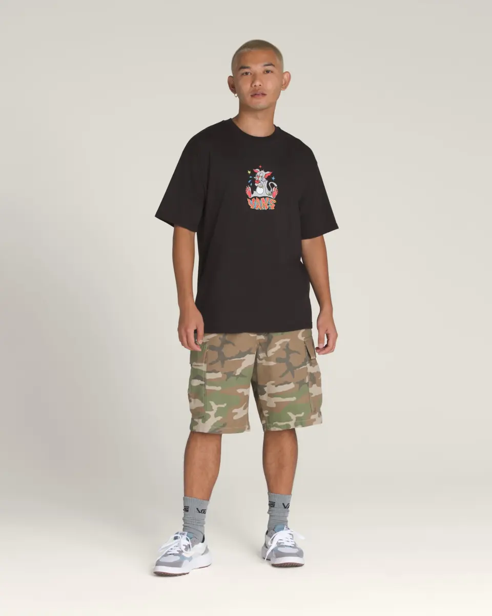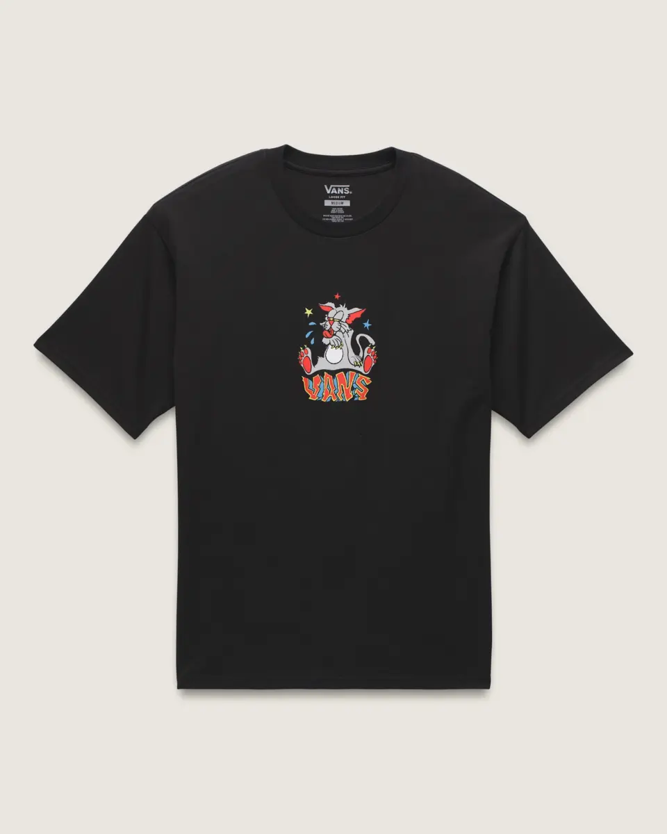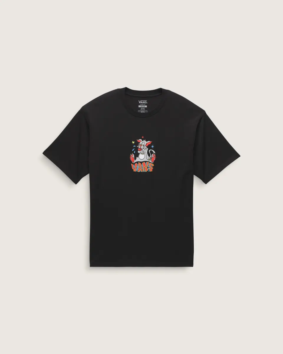 Détendez-vous avec le t-shirt Frizz, un t-shirt ample à manches courtes et col ras du cou avec un motif sérigraphié d’un chat dans le vide assis sur le logo Vans®.