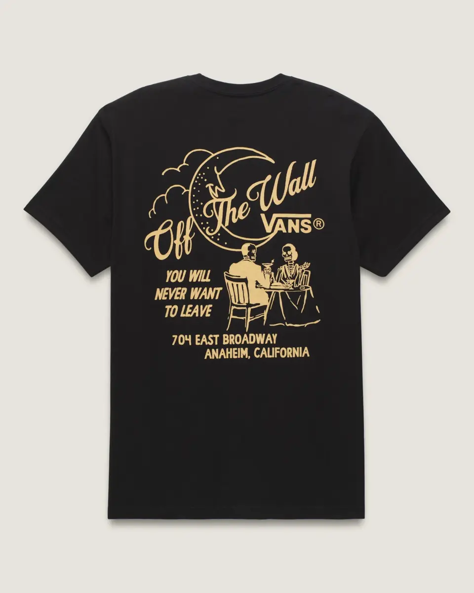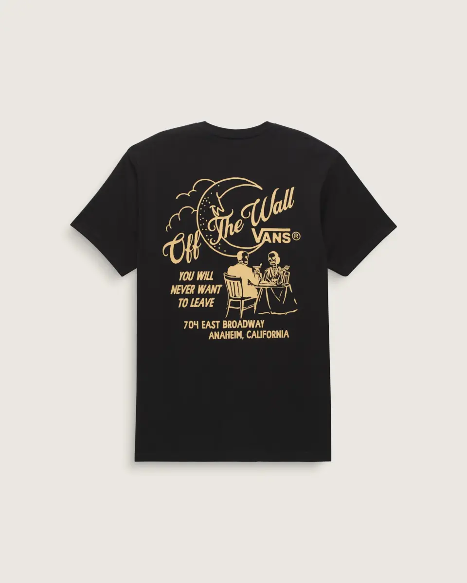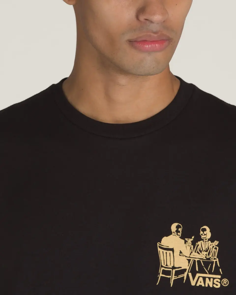 Soyez chic avec le t-shirt Fine Dining, un t-shirt classique à manches courtes et col ras du cou avec des graphismes sérigraphiés de squelettes en train de manger au-dessus du logo Vans® sur le devant, et un graphisme plus grand de la même scène au clair de lune au dos.